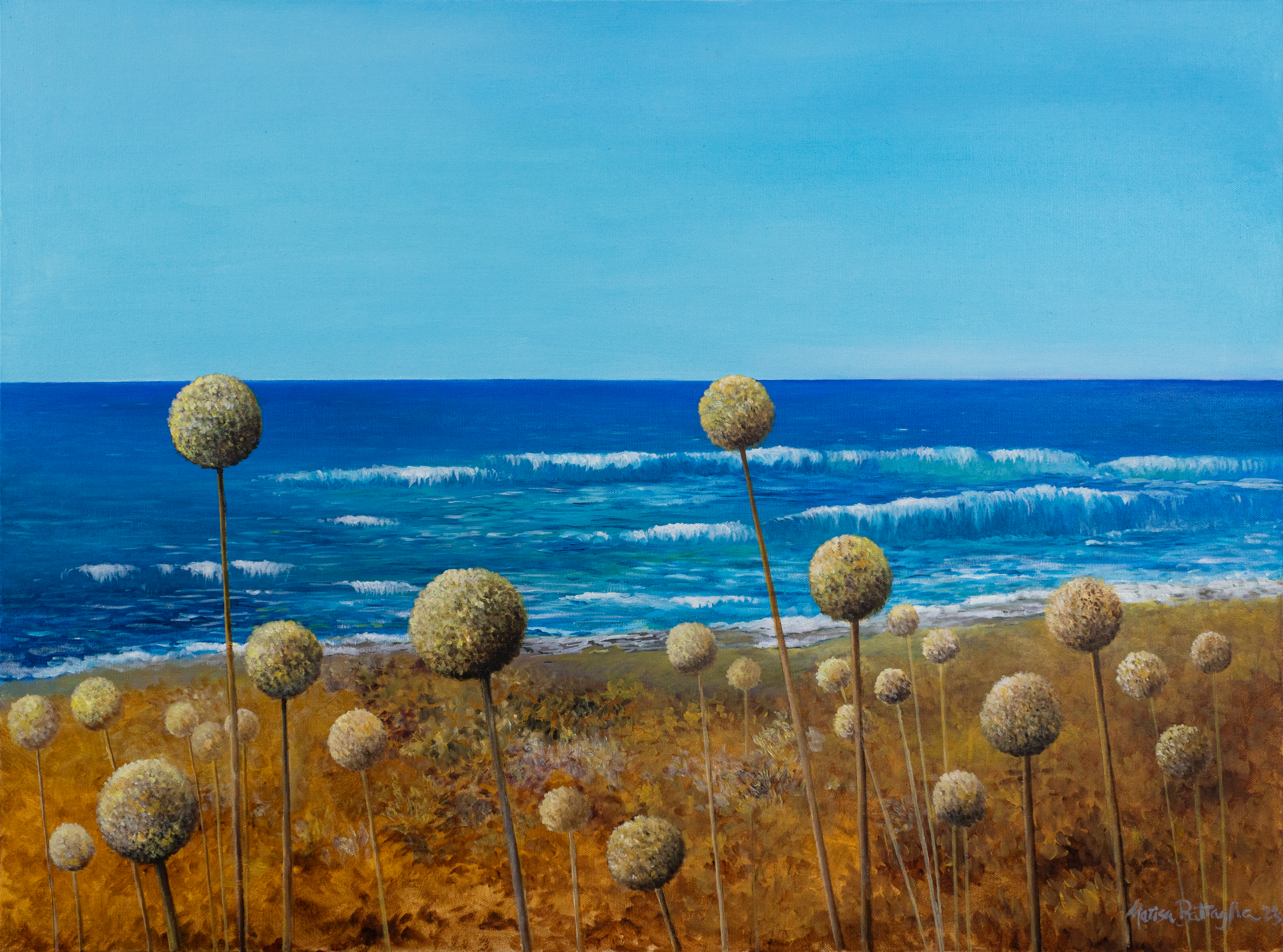 Paesaggio tipicamente mediterraneo con i fiori d'aglio che svettano sul mare
